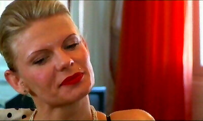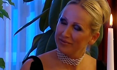 Busty German Cougar riding a loaded cock in her ebony stockings
