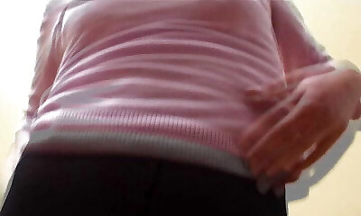 Outstanding German Cougar with huge boobs dildoing her shaved puss in the kitchen